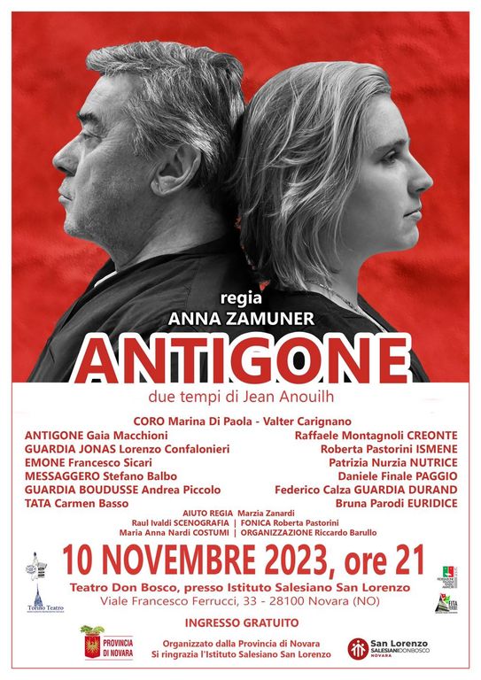 "Lo spettacolo si terrà alle 21 del prossimo 10 novembre al teatro dell’Istituto salesiano “San Lorenzo”, in viale Ferrucci a Novara, che ringraziamo per la sempre squisita collaborazione: “Antigone”, atto unico in due tempi di Jean Anouilh con regia di Anna Zamuner, nasce da un progetto che la Provincia ha coordinato insieme con le associazioni culturali “La rete di Atena” e “Torino Teatro Operetta”, che propongono un dramma ispirato alla tragedia di Sofocle nel quale, secondo le intenzioni di Anouilh, viene presentato, attraverso le figure dell’opera classica, il rapporto dialettico tra una figura oppressa e quella di un oppressore, contenuto che, nel nostro caso, viene “letto” pensando alla condizione delle donne vittime di violenza. Come nel caso delle precedenti e analoghe iniziative promosse dal nostro Servizio l’obiettivo è quello di accendere i riflettori su un tema sul quale dobbiamo costantemente prendere coscienza attraverso azioni e politiche concrete, ma anche con il dibattito e il confronto da sollecitare nell’opinione pubblica".