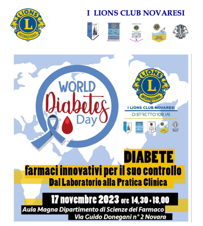 Alle 14.30 i saluti iniziali e l’inaugurazione del convegno “Diabete, Farmaci innovativi per il suo controllo, dal laboratorio alla pratica clinica”; modera il Prof. Giancluca Aimaretti – Direttore SCDU Endocrinologia AOU Maggiore della Carità, prof. Ordinario UPO. Di seguito l’elenco completo dei partecipanti e dei relatori: Prof. Gian Carlo Avanzi, Magnifico Rettore UNIUPO; Prof. Armando Genazzani, Direttore di Dipartimento di Scienze del Farmaco UPO; Dott. Michele Giannone, Governatore Lions Distretto 108 IA1; Dott. Massimo Conocchia, Presidente Lions Club Novara Host; Dott. Alessandro Canelli, Sindaco di Novara; Dott. Federico Perugini, Consigliere Regionale; Dott. Gianfranco Zulian; Direttore Generale AOU Maggiore della Carità; Dott. Angelo Penna, Direttore Generale ASL Novara; Dott. Franco Ripa, Regione Piemonte – Programmazione dei servizi sanitari e socio-sanitari; Prof. Paolo Marzullo, Dipartimento Endocrinologia AOU e Prof. Ass. di Endocrinologia UPO; Dott. Federico D’Andrea, Medico Chirurgo e Dietologo; Prof. Armando Genazzani, Direttore di Dipartimento di Scienze del Farmaco UPO; Dott.sa Sara Caccamo, Dott.sa Maura Urdich, Infiermieristica; Prof.ssa Ivana Rabbone, Direttore Struttura Complessa di Pediatria e Prof. Ass. UPO; Dott. Lucia Piantanida, Testimonial e Assessore Comune di Novara; Dott. Matteo Marnati, Assessore Regionale – ricerca, innovazione, ambiente; Dott. Mauro Andretta, A.I.L.D – Associazione Italiana Lions per il Diabete; Dott.sa Maria Chantal Ponziani, Direttore Struttura Diabetologia ASL Novara.