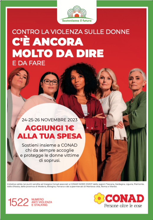 “Contro la violenza sulle donne c’è ancora molto da dire e da fare”: questo il messaggio della campagna di raccolta fondi che, in occasione della Giornata internazionale per l’eliminazione della violenza contro le donne, Conad Nord Ovest e i soci sul territorio promuovono a favore di D.i.Re – Donne in Rete contro la violenza, l’associazione nazionale che supporta circa 21.000 donne, attraverso il lavoro quotidiano di oltre 100 centri antiviolenza e più di 60 case rifugio sul territorio nazionale, in sinergia con gli enti locali per supportare migliaia di donne e ragazze nel percorso per riconquistare la propria vita.