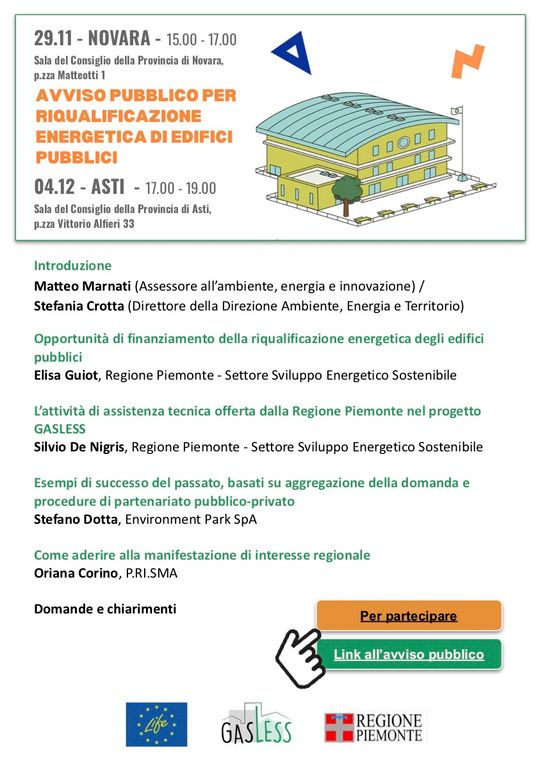 L’aula consiliare di palazzo Natta ospiterà, dalle 15 alle 17 del prossimo 29 novembre, l’incontro sul tema “Avviso pubblico per la riqualificazione energetica di edifici pubblici” organizzato dalla Regione Piemonte. Tutte le informazioni sul bando sono disponibili al link https://bandi.regione.piemonte.it/avvisi-beni-regionali/avviso-pubblico-manifestazione-interesse- enti-pubblici-piemonte-supportare-riqualificazione.