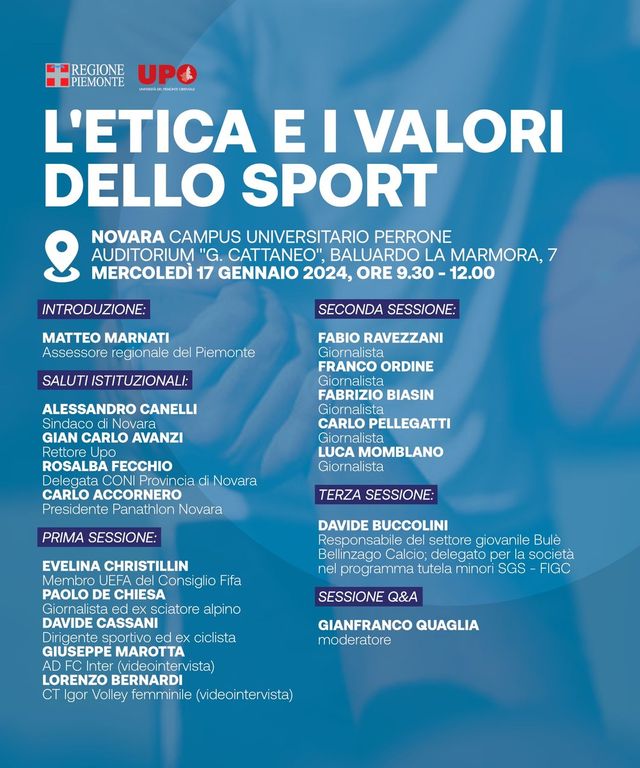 Mercoledì 17 gennaio dalle 9.30 a Novara, all’Auditorium Cattaneo del Campus universitario Perrone, Baluardo La Marmora 7, si svolgerà il convegno “L’etica e i valori dello sport”.