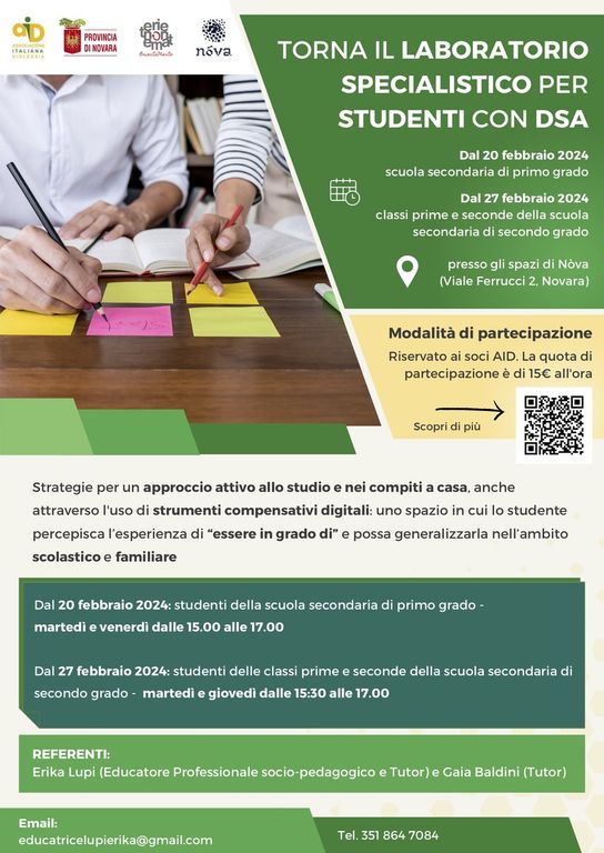 "L’Ente – spiega il consigliere delegato Andrea Crivelli – patrocina il laboratorio specialistico per studenti con Dsa, iniziativa organizzata da Aid e “Orientamente” che si terrà negli spazi di “Nòva”, a Novara, dal prossimo 20 febbraio per i ragazzi della Scuola secondaria di Primo grado e dal 27 febbraio per le classi I e II della Scuola secondaria di Secondo grado. Questi laboratori si inseriscono nella serie di azioni e di proposte socio-educative che, già da qualche anno, vengono promosse dalla Provincia in concerto con gli organizzatori. In passato sono stati promossi partecipatissimi corsi di aggiornamento e formazione rivolti ai docenti, mentre quest’anno si è pensato di strutturare nuove opportunità per i ragazzi, che stanno accogliendo l’iniziativa, curata da educatori socio-pedagogici e da tutor, con grande entusiasmo".