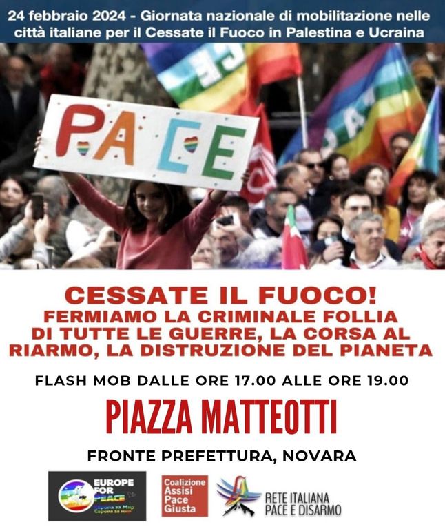 Nell'ambito della mobilitazione promossa a livello nazionale dalla Rete Italiana Pace e Disarmo per il cessate il fuoco in Ucraina e in Palestina, organizzato da Cgil, Anpi, Arci, Acli, Assopace, Emergency sabato prossimo, 24 febbraio dalle 17 alle 19 in piazza Matteotti a Novara, è in programma un flashmob.