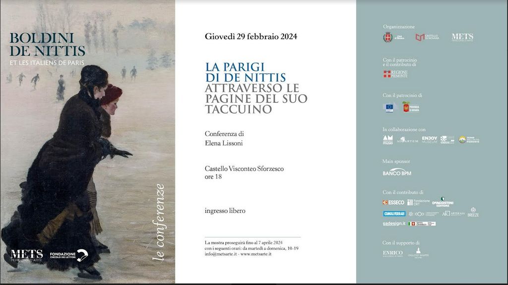 A tal proposito, proseguono le conferenze di Mets. La prossima, quella del 29 febbraio, vedrà come relatrice non Paola Zatti, come inizialmente annunciato, che non potrà essere presente, ma un’altra ospite d'eccezione, Elena Lissoni, storica dell'arte (in allegato unabreve presentazione). Elena Lissoni co-curatrice della mostra "Hayez. L'officina del pittore romantico" in corso alla Gam di Torino e soprattutto autrice delle schede critiche delle opere di De Nittis pubblicate sul catalogo della mostra di Novara, terrà una conferenza dal titolo "La Parigi di De Nittis attraverso le pagine del suo taccuino".