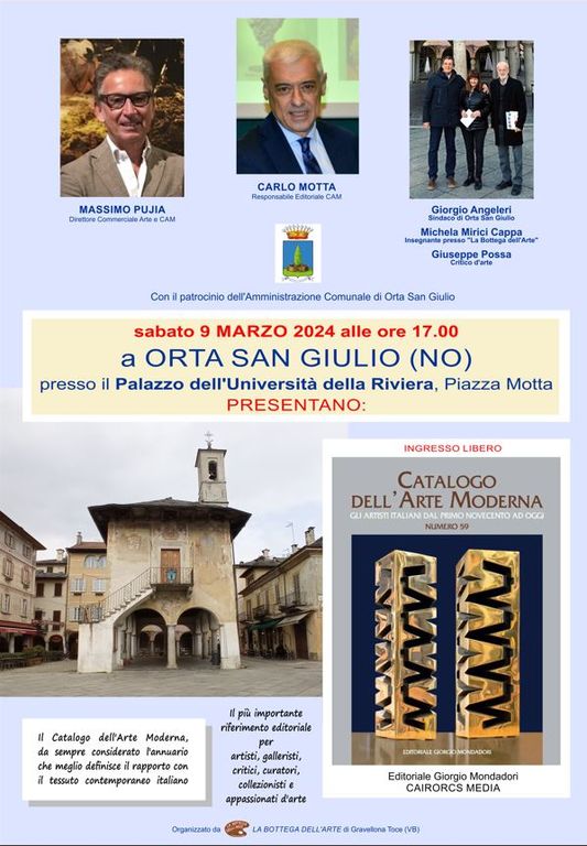 Sabato 9 marzo, alle ore 17.00, il Palazzo dell’Università della Riviera di Orta San Giulio (in piazza Motta) ospita la presentazione del “Catalogo dell’Arte Moderna”, a cura di Carlo Motta, responsabile editoriale, e Massimo Pujia, direttore commerciale. Durante l’evento, organizzato da La Bottega dell’Arte di Gravellona Toce con il patrocinio del comune di Orta San Giulio, sarà presente anche il sindaco Giorgio Angeleri, mentre il critico d’arte Giuseppe Possa introduce la presentazione.