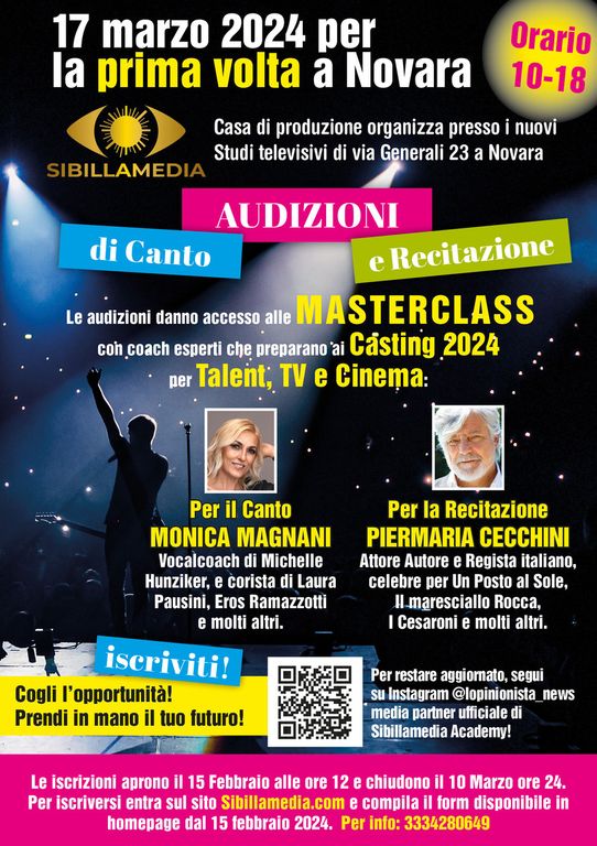 Per la prima volta a Novara si terranno le audizioni gratuite per accedere alla masterclass di canto e recitazione ideate appositamente per preparare gli artisti a partecipare efficacemente ai Casting 2024 (es: per i talent The Voice Kids, The Voice Senior, X Factor, Italia’s got talent); un percorso per prepararsi alla professione e offrire la possibilità di uno sbocco professionale concreto in questo mondo, facendo da ponte con le diverse produzioni tv. Nella cornice dei nuovi studi televisivi Sibillamedia in Via Generali 23, domenica 17 marzo dalle 10 alle 18 si terrà una giornata davvero speciale, con le selezioni per poter entrare in questo percorso a numero chiuso, in compagnia di due esperti e grandi professionisti del canto e della recitazione: Monica Magnani per il Canto e Pier Maria Cecchini per la Recitazione.