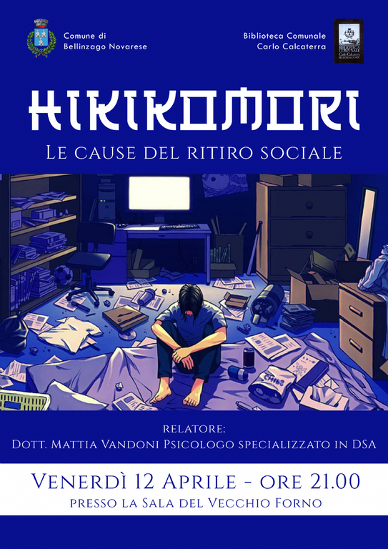 Il 12 aprile, alle 21:00, nella Sala Vecchio Forno della biblioteca Calcaterra, il dottor Mattia Vandoni, psicologo specializzato nei Disturbi Specifici dell'Apprendimento (DSA), condurrà una conferenza su Hikikomori: le cause di questa forma di isolamento sociale.
