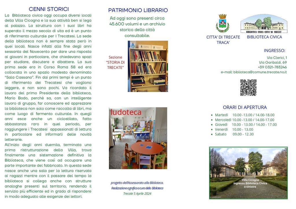Negli scorsi giorni la Biblioteca civica ha predisposto "un nuovo pieghevole – annunciano il sindaco Federico Binatti e l’assessore alla Biblioteca Fortunata Patrizia Dattrino – con il quale pubblicizzare al meglio, oltre agli orari di apertura e le classiche informazioni utili, i servizi offerti alla cittadinanza, offrendo inoltre informazioni di carattere storico e culturale riguardanti la storia della nostra Biblioteca. Si tratta di un’iniziativa che abbiamo voluto realizzare per riattualizzare un analogo strumento che risultava ormai datato e con il quale ci auguriamo di poter ulteriormente coinvolgere i Trecatesi nelle attività organizzate e nella frequentazione di questo luogo di cultura della nostra città".