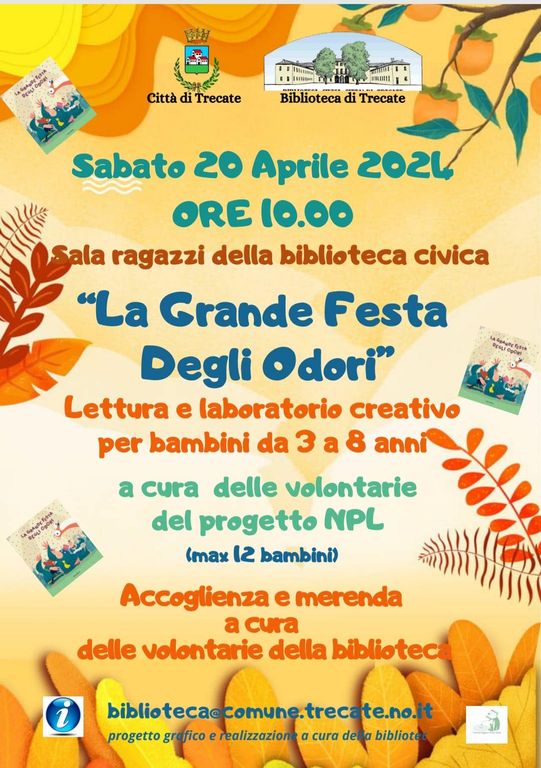 Nuovo laboratorio di lettura e creatività organizzato dalla Biblioteca civica. "Il tema – spiegano il sindaco Federico Binatti e l’assessore alla Biblioteca Fortunata Patrizia Dattrino – è “La grande festa degli odori”: l’appuntamento, coordinato dalle volontarie del progetto “Nati per leggere” per i bambini da 3 a 8 anni per un massimo di dodici partecipanti, è alle 10 del prossimo 20 aprile nella Sala Ragazzi. E’ prevista l’accoglienza e una merenda curate dalle volontarie della Biblioteca".