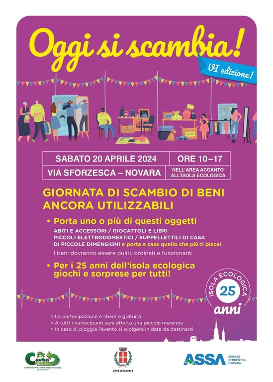 Sabato 20 aprile 2024, dalle 10 alle 17, presso l’isola ecologica di Via Sforzesca, a Novara si terrà la sesta edizione di Oggi si scambia, la giornata di scambio gratuito, tra privati, di oggetti ancora in buono stato e funzionanti. Un evento a cui sono possono partecipare i cittadini residenti a Novara che potranno scambiare abiti e accessori, giochi, libri e fumetti, piccoli elettrodomestici, suppellettili di casa di piccole dimensioni, oggetti che dovranno essere puliti, ordinati e ancora utilizzabili.