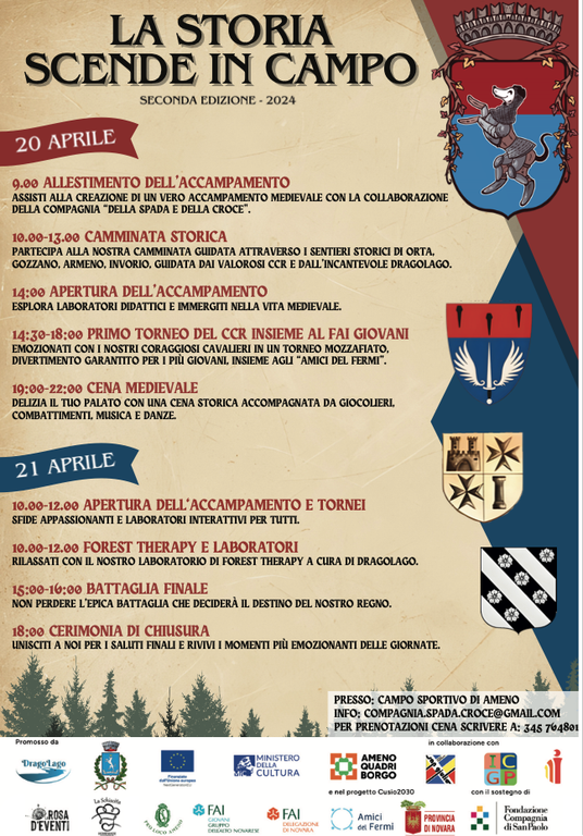Sabato 20 e domenica 21 aprile, la storia scende in campo e prende vita ad Ameno, sulle colline del Lago d'Orta. La Compagnia della Spada e della Croce e Associazione DragoLago, nell’ambito del progetto PNRR Ameno Quadriborgo, propongono due giornate di rievocazione storica con un campo medievale allestito da quattro compagnie di rievocatori provenienti da diverse parti del Nord Italia. La manifestazione, perfetta per famiglie, giovani e appassionati di rievocazioni storiche, si svolgerà presso il campo sportivo di Ameno (viale Matteotti), sarà gratuita e permetterà a tutti di passare un momento unico di divertimento in compagnia, in un'atmosfera magica.