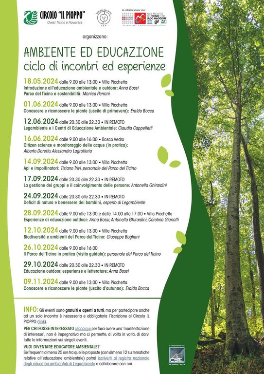 Gli eventi sono gratuiti e aperti a tutti, previa iscrizione al Circolo Il Pioppo. È possibile inviare una "manifestazione di Interesse" tramite il link https://www.eventbrite.it/.../biglietti-ambiente-ed... per ricevere informazioni e link di iscrizione per ogni singolo evento.