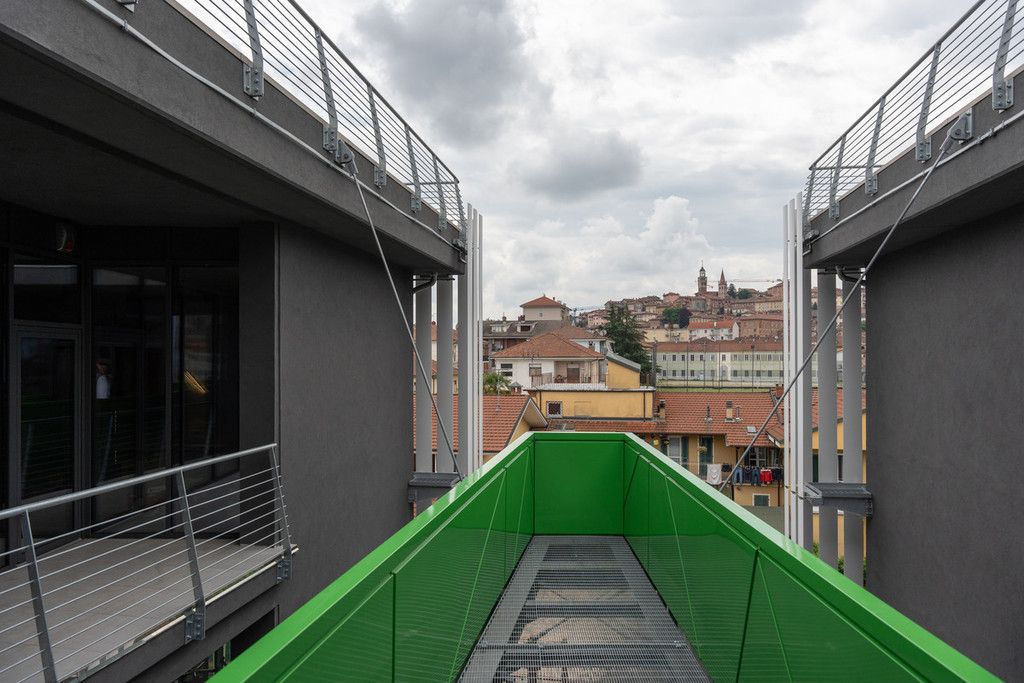 Tra le particolarità quella che rende l’edificio un unicum, organico e dinamico traduttore del concetto di curiosità aziendale. Sono le centosettanta lamelle in alluminio che rivestono la struttura, alte dodici metri, ritorte in senso orario e antiorario e richiamanti il movimento dell’energia. La loro realizzazione ispirata al disegno di un edificio londinese, è made in Terre del Monviso, firmata da Millone Serramenti di Moretta.