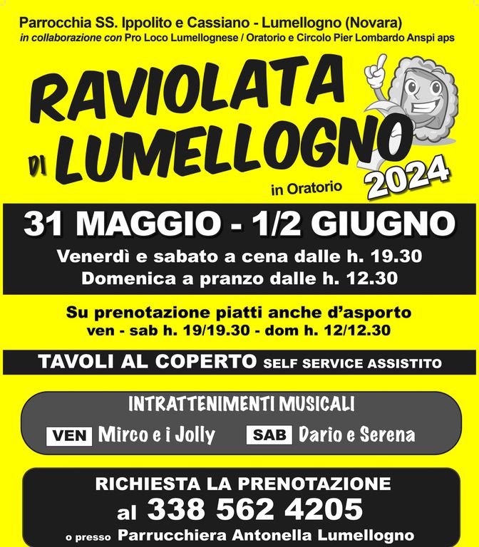 Fervono i preparativi a cura dei volontari della Parrocchia dei Santi Ippolito e Cassiano di Lumellogno per l'edizione del 2024 della "Raviolata" che si tiene da 26 anni. Venerdì 31 maggio e sabato 1 giugno a cena dalle 19.30 e domenica 2 giugno a pranzo dalle 12.30, nel cortile dell'oratorio in vicolo Canonica, si potranno gustare i rinomati ravioli ai tre sughi.
