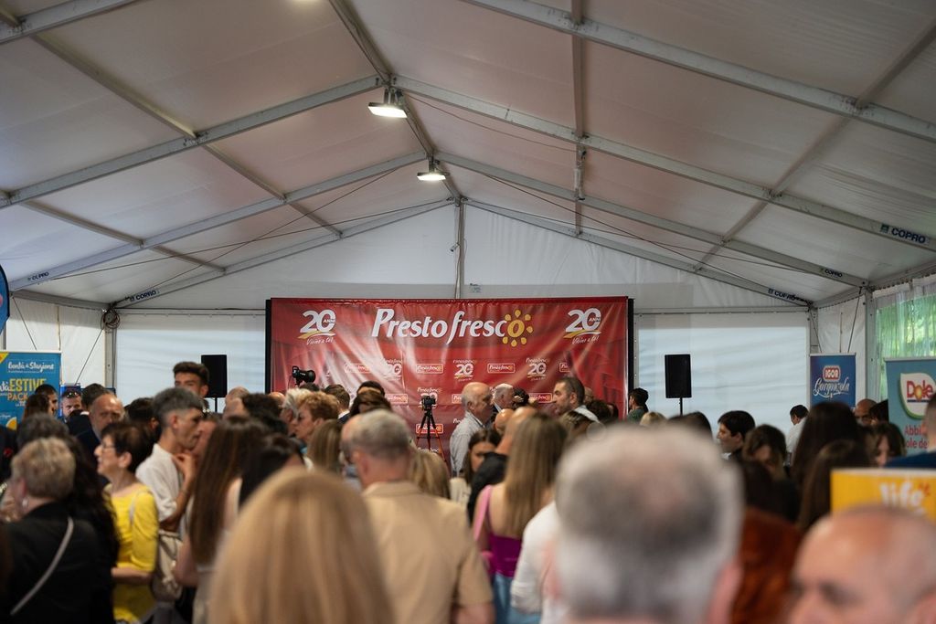 Nel giardino dell’ Hotel Il Giardino dei Tigli a Cussanio (Fossano), durante un apericena organizzato dai fornitori di gruppo, fra musica e chiacchiericcio, si è dato il via all’Evento di anniversario. Poi gli invitati sono entrati nel grandissimo salone apparecchiato a festa, e sul palco si sono via via passati il microfono i protagonisti del successo di Prestofresco in 20 anni di attività. L’Amministratore Delegato, Sebastiano Sapino, ha raccontato il successo di una filosofia vincente che, a partire dal 2004 ha portato il marchio ad essere sempre più scelto per l’indiscussa qualità di prodotti e del servizio offerto. I numeri, oggi, ne confermano il successo: 10 milioni di clienti, 820 dipendenti, di cui il 73% donne e di cui il 75% sono rapporti di lavoro indeterminato. Ha parlato anche Pierantonio Sapino, che ha fondato i primi punti vendita insieme ai 3 fratelli, emozionato e felice ma sicuro, oggi come ieri, che la strada è quella giusta. Fra le tante presenze e interventi, anche quello di Alberto Cirio, amico e testimone di questi anni di crescita e affermazione di Prestofresco.