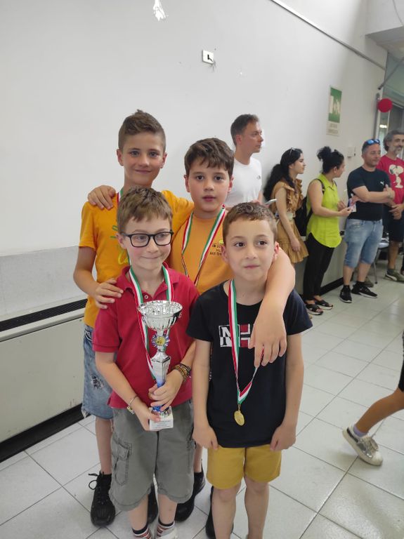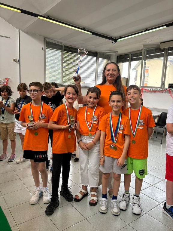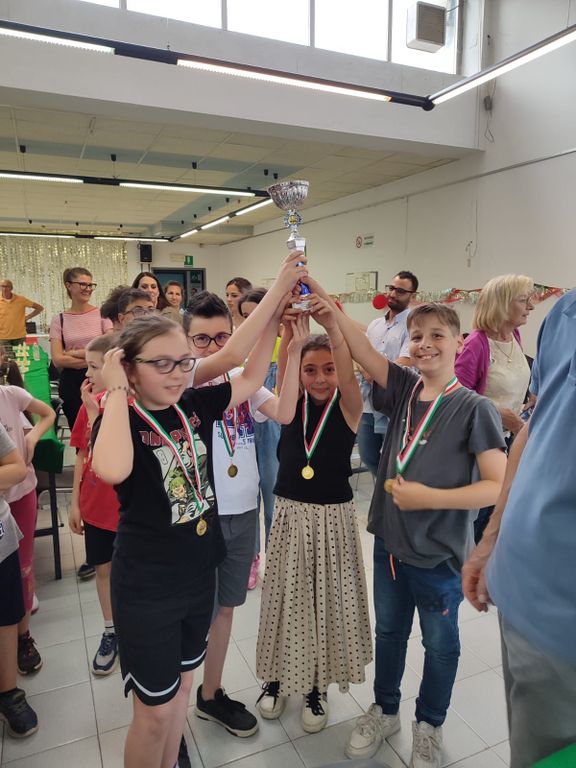 Nella mattinata si è giocato il torneo delle classi quarte: dopo aver già vinto in primavera la fase provinciale dei Campionati Studenteschi, i bambini della 4a C della scuola “Tadini” di Cameri (Federico Rovea, Emanuele Lentini Campallegio, Ludovica Mangini, Matilde Quaglia, Alessio Lovati) accompagnati dalla loro maestra e Istruttore ECU Elena Villani, partivano coi favori del pronostico ed in effetti si sono confermati i più bravi anche in questa occasione, pur dovendo faticare più del previsto per avere ragione di una concorrenza qualificata e motivata. I giovani cameresi si sono imposti con 15,5 punti, staccando solo nel finale i rivali della 4a della “Pertini” di Oleggio Castello (12 punti), che ha sorpreso molto positivamente essendo stata l’ultima in ordine di tempo a seguire i corsi di scacchi, completati solo a maggio dalla giovane istruttrice Greta Brusati (FIDE Developmental Instructor), alle prime esperienze “in totale autonomia” nelle scuole. La medaglia di bronzo è andata alla classe 4a A della “Piero Angela” di Bellinzago (IC Antonelli) con 10,5 punti. Nella classifica individuale il primo posto è andato al camerese Emanuele Lentini Campallegio (5 su 6) davanti al compagno di classe Federico Rovea e ad Alessandro Bertola di Oleggio Castello. Successo per Cameri anche nel settore femminile, con Ludovica Mangini (4,5 punti) a precedere Caterina Cattaneo e Alice Gentina, entrambe della squadra di Oleggio Castello.