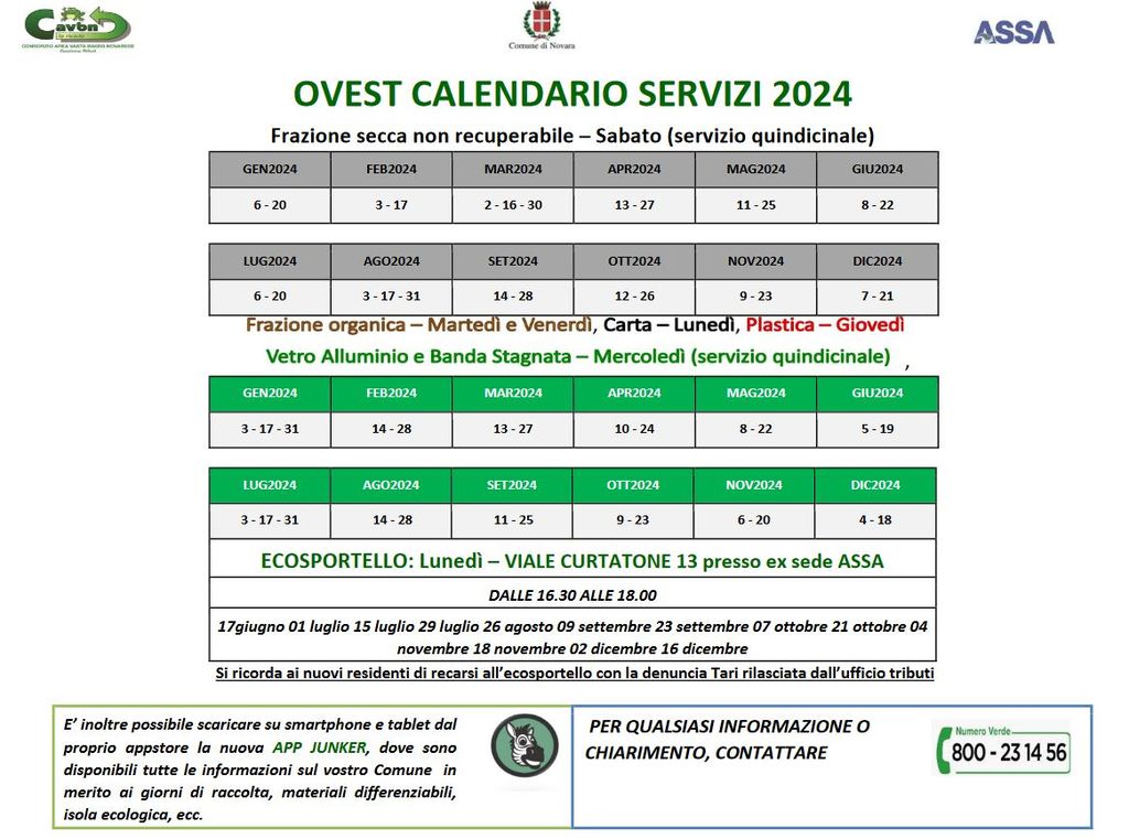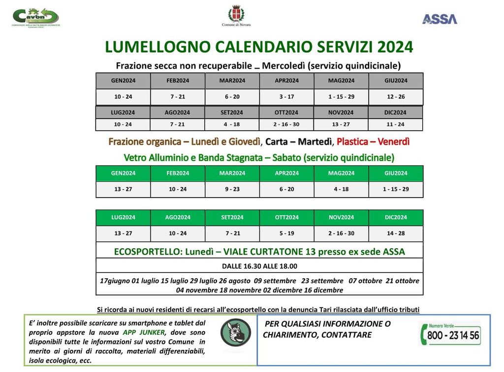 A partire dal pomeriggio di oggi, lunedì 17 giugno 2024, è operativo l'Ecosportello per la distribuzione della dotazione destinata alla raccolta dei "rifiuti non recuperabili" nei quartieri ovest, Lumellogno e sud, compreso il Torrion Quartara. Il punto di distribuzione si trova in Viale Curtatore 13, presso l'ex sede Assa, dalle 16:30 alle 18:00, nelle seguenti date: 17 giugno, 1 luglio, 15 luglio, 29 luglio, 26 agosto, 9 settembre, 23 settembre, 7 ottobre, 21 ottobre, 4 novembre, 18 novembre, 2 dicembre, 16 dicembre.