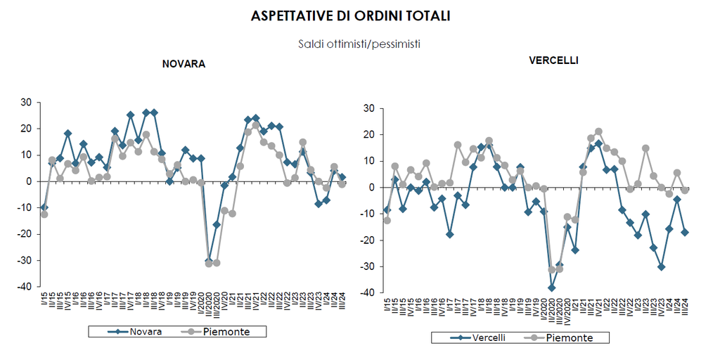 I saldi ottimisti/pessimisti relativi agli ordini totali e a quelli esteri passano, rispettivamente, da 4,1 a 1,6 e da -3,8 a 2 punti in provincia di Novara, da -4,5 a -17 e da -9,3 a -7,4 punti in provincia di Vercelli (a fronte di una media piemontese che cala, rispettivamente, da 5,6 a -1,1 e da -4,7 a -7,2 punti). Le previsioni di investimenti “significativi” passano dal 32,5% al 35% tra le imprese novaresi e dal 18,6% al 17,4% in provincia di Vercelli (con la media regionale in ripresa dal 24,1% al 25,9%), mentre quelli “sostitutivi” calano dal 47,5% al 41% nel Novarese e registrano un incremento dal 45,3% al 50% nel Vercellese e in Valsesia (la media regionale è in diminuzione dal 49,9% al 46,1%).
