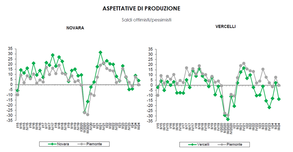 Peggiorano le prospettive dell’industria nelle province di Novara e di Vercelli. Secondo le previsioni congiunturali di Confindustria Novara Vercelli Valsesia (Cnvv) per il trimestre luglio-settembre 2024 (disponibili sul sito www.cnvv.it) il saldo tra la percentuale degli imprenditori che si dichiarano ottimisti e quella di coloro che sono pessimisti sull’incremento della produzione è a 4 punti (rispetto ai precedenti 8,9) nel Novarese e a -13,6 punti (rispetto ai precedenti 2,3) in provincia di Vercelli, con una media regionale che cala da 7,7 a -0,1 punti.