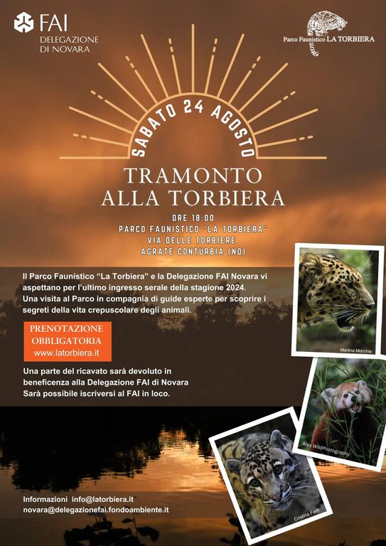 orna l'attesissimo evento Tramonto alla Torbiera, organizzato dalla Delegazione FAI di Novara e dal Parco Faunistico La Torbiera. L'appuntamento è fissato per le 18 del prossimo 24 agosto, in occasione dell'ultimo ingresso serale della stagione 2024. I visitatori avranno l'opportunità di esplorare il parco al calar del sole, accompagnati da guide esperte che sveleranno i segreti della vita crepuscolare degli animali.