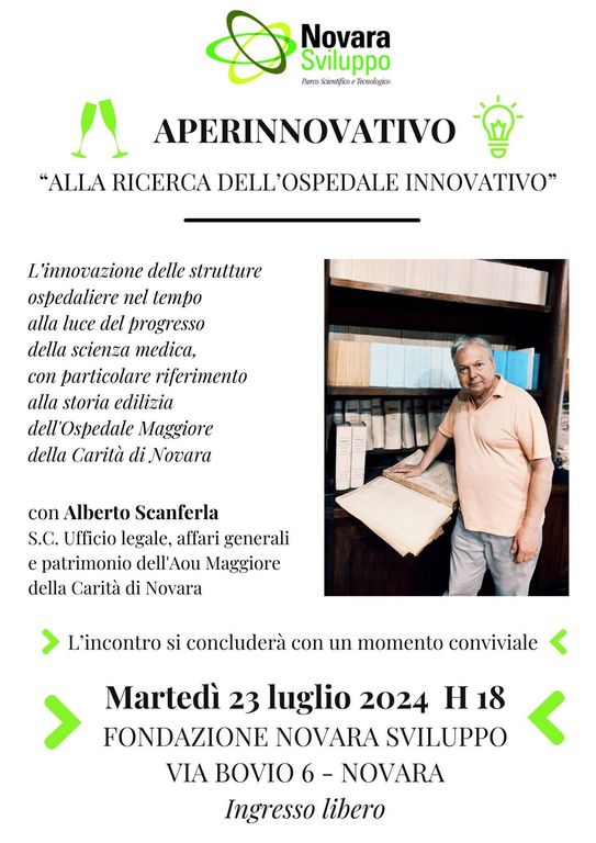 La Fondazione Novara Sviluppo organizza un nuovo incontro dell'iniziativa Aperinnovativo alle 18 del prossimo 23 luglio. Il tema sarà "Alla ricerca dell'ospedale innovativo", dove si discuterà di come le strutture sanitarie sono state modificate nel tempo, andando di pari passo con le innovazioni della scienza medica.
