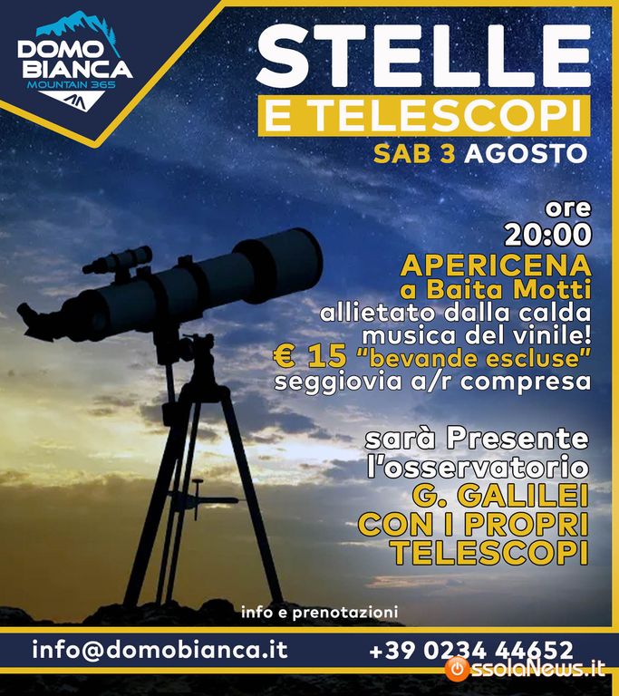 La giornata non finisce qui, alle 20:00 l’imperdibile evento “Stelle e Telescopi” a Baita Motti dove gli esperti dell’Osservatorio Astronomico Galileo Galilei di di Suno (No) con i loro telescopi introdurranno i presenti alle meraviglie splendenti dell’universo. Ad arricchire la serata un apericena allietato da un accompagnamento musicale. Il tutto al costo di 15 euro per il passaggio in seggiovia di andata e ritorno (bevande escluse).