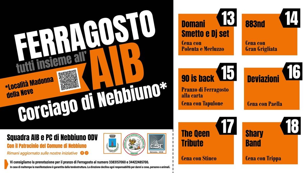 Nebbiuno si prepara ad accogliere la tanto attesa festa di "Ferragosto tutti insieme...all'AIB", organizzata dalla Squadra Anti Incendi Boschivi e Protezione Civile di Nebbiuno e del Vergante ODV, con il patrocinio del Comune di Nebbiuno. Dal 13 al 18 agosto, nella frazione di Corciago (Madonna della Neve), si terranno sei giorni di musica, cibo e convivialità, con l'obiettivo di raccogliere fondi per sostenere le attività dell'AIB e finanziare l'acquisto di un nuovo mezzo attrezzato per le operazioni sul campo.