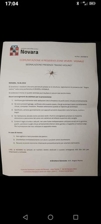 Una invasione di ragni violino in due quartieri alla periferia nord di Novara. La notizia, pubblicata su uno dei più popolari gruppi Facebook della città piemontese (“Sei di Novara se…”), che annovera quasi 40.000 iscritti, fa rapidamente il giro del web. Ma si tratta di una fake news. Un falso ben realizzato, apparentemente su carta intestata dell’Asl di Novara, con tanto di numero di protocollo e di firma del direttore generale dottor Angelo Penna. Un falso soprattutto, che ha generato un certo allarme. Nel testo si legge tra l’altro che “il morso di questo animale puòl risultare in alcuni casi anche letale”. Il falso comunicato indicava poi alcune prescrizioni “per la prevenzione” tra cui “verificare giornalmente nelle abitazioni che le finestre e le porte siano ermeticamente chiuse” oppure “Se l’abitazione è ubicata vicino ad aree verdi o fiumi, è consigliabile prestare la massima attenzione e percorrere tali zone con calzature ad altezza superiore alla caviglia”.