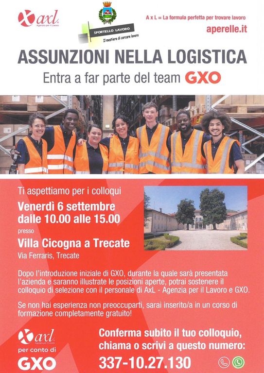 Dalle 10 alle 15 del prossimo 6 settembre, nell’auditorium di villa Cicogna, la Città di Trecate con la Convenzione Sportelli per il Lavoro (della quale Trecate è Ente capofila e alla quale aderiscono Borgolavezzaro, Cerano, Garbagna Novarese, Nibbiola, Romentino, Sozzago, Terdobbiate, Tornaco e Vespolate) organizza con “AxL Agenzia per il Lavoro” e “GXO” (il più grande provider pure-player di contract logistics del mondo) un evento dedicato alla selezione di nuove figure professionali per il polo logistico gestito da “GXO” a Trecate.