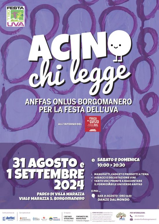 In occasione della tradizionale Festa dell’Uva di Borgomanero, torna uno degli eventi più attesi e significativi: “Acino Chi Legge”, organizzato da Anffas Onlus Borgomanero. Questo evento, che si terrà il 31 agosto e 1 settembre 2024 presso il Parco di Villa Marazza, è molto più di una semplice celebrazione del vino e del buon cibo. È un momento di incontro, solidarietà e condivisione, in cui il territorio si unisce per supportare le attività di Anffas e promuovere l’inclusione.
