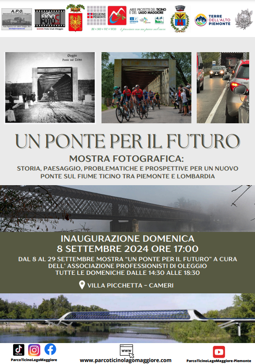 Inaugurazione domenica 8 settembre ore 17:00 Villa Picchetta, Cameri. La mostra fotografica, sarà visitabile dall' 8 fino al 29 settembre, tutte le domeniche dalle 14:30 alle 18:30. in Villa Picchetta, Cameri, si svilupperà attraverso un percorso che permetterà inizialmente, come prima sezione, la lettura della storia del ponte nella sezione che documenta le modalità di attraversamento del fiume prima della costruzione del ponte stesso, il progetto della struttura, la sua costruzione e le varie fasi storiche attraversate, con l’evoluzione dei mezzi di locomozione (si racconteranno anche i tentativi di bombardamento durante la seconda guerra mondiale).Le foto provengono da diverse fonti e sono state recuperare anche grazie alla collaborazione delMuseo Civico Etnografico “C.G. Fanchini” di Oleggio.