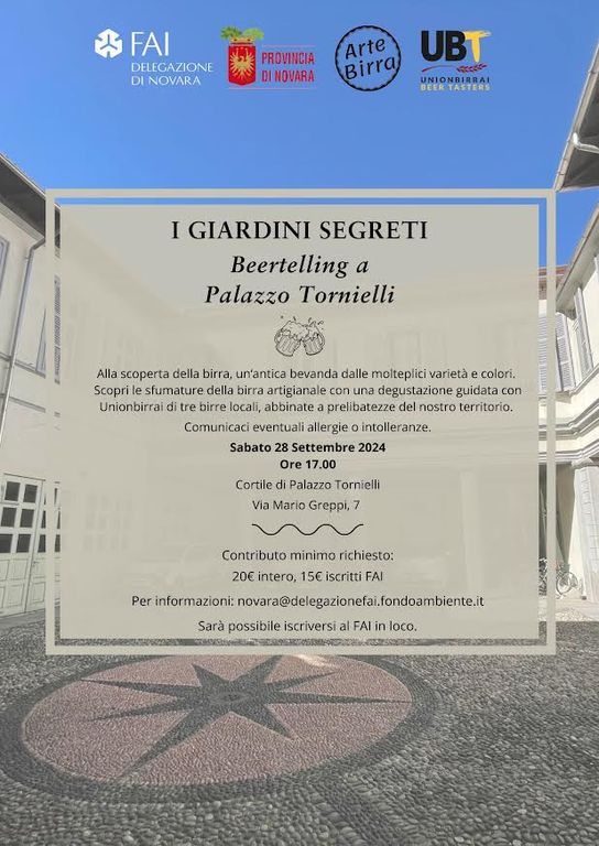 La delegazione Fai Novara, in collaborazione con la provincia di Novara, organizza l'evento "I Giardini Segreti: beertelling a Palazzo Tornielli". L’evento si terrà il 28 settembre dalle 17.00. Sarà possibile partecipare a una degustazione esclusiva all’interno della cornice artistica offerta dal cortile di Palazzo Tornielli: con la collaborazione di Unionbirrai sarà infatti possibile andare alla scoperta della birra, un’antica bevanda dalle molteplici varietà e colori, assaporandone le diverse sfumature e gusti. In particolare, grazie ad una degustazione guidata, potranno essere assaggiate tre birre artigianali locali abbinate a prelibatezze tipiche del nostro territorio.