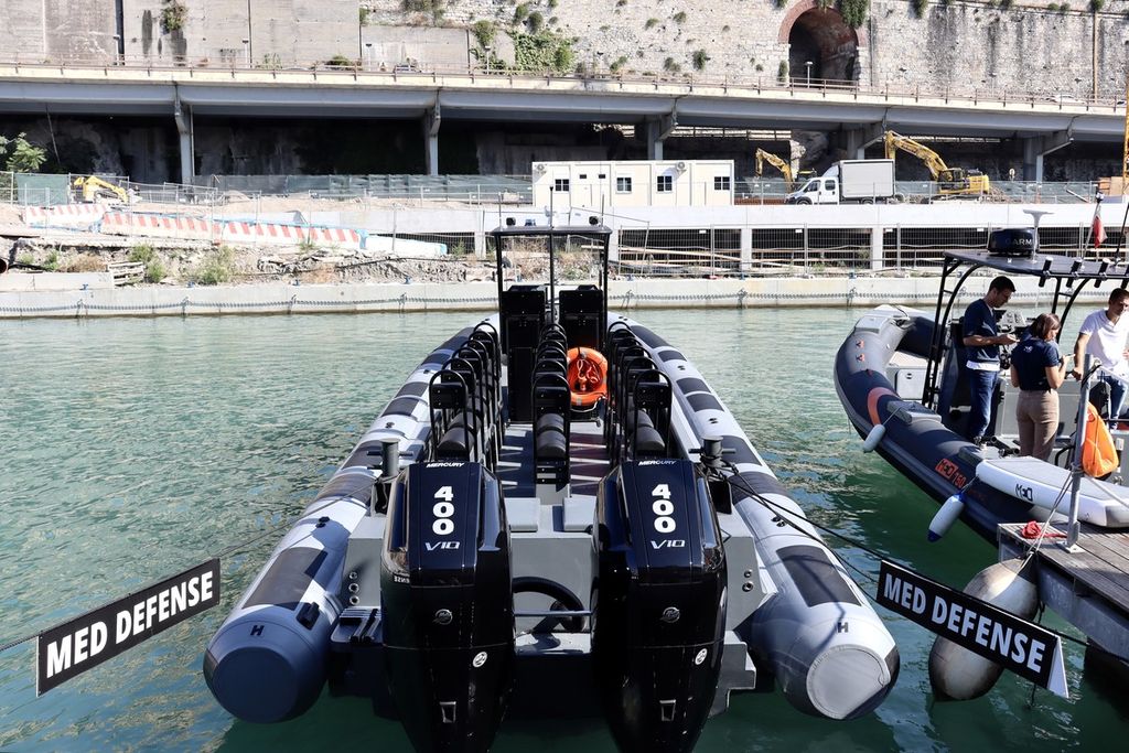Il rhib MED DEFENSE, lunghezza massima di 11,45 mt. e larghezza 3,50 mt, (scafo realizzato in lega di alluminio 5083 e tubolare pneumatico “ibrido” formato da una camera interna gonfiabile rivestita da uno strato di 8 cm di materiale poliuretanico a cellula chiusa) è stato equipaggiato con due motori fuoribordo da 400 Hp e due sedute ammortizzate per il pilota e copilota e 18 sedute jockey dedicata al trasporto di persone.