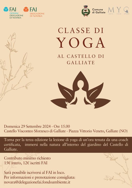 Il 29 settembre, alle ore 15:00, il giardino del Castello di Galliate ospiterà la terza edizione della classe di yoga, tenuta da una coach certificata Yoga Alliance. Questa iniziativa, promossa dalla Delegazione del FAI di Novara e dal Comune di Galliate, offre l'opportunità di praticare yoga in un ambiente storico e naturale.