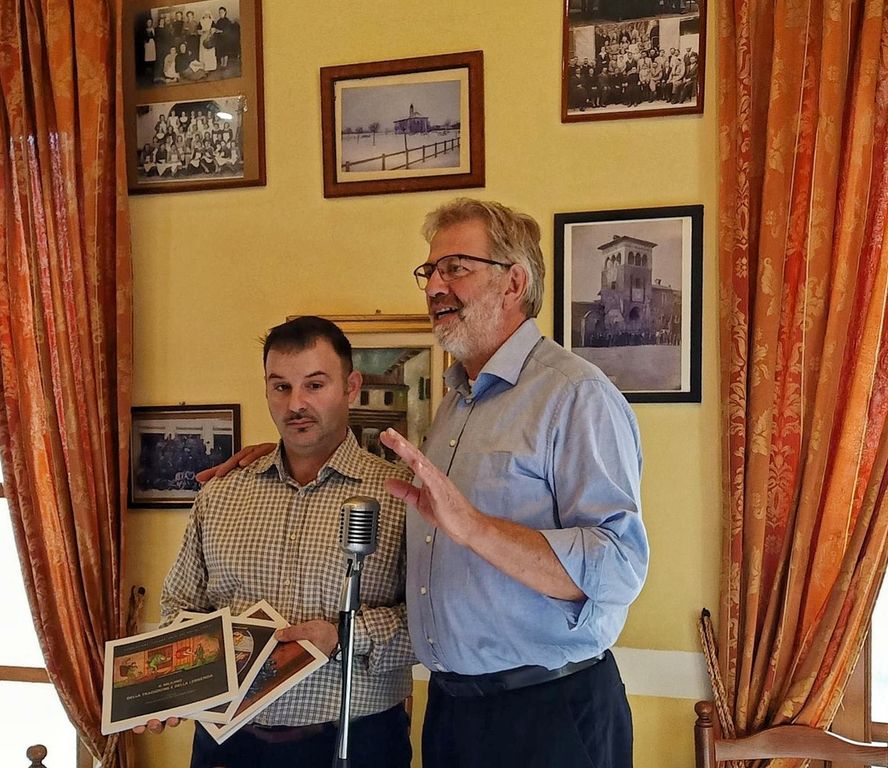 Prima di procedere alla visita del Mulino e delle schede storiche, delle mappe e dei documenti ivi esposti si è dato spazio all’intervento conclusivo pronunciato dal moderatore, il quale fra l’altro, in occasione di una giornata così significativa, ha inteso omaggiare la famiglia Cavagnino ed in particolare il Mulino di una sua pubblicazione dal titolo “In grembo alla Terra. Affreschi sul mondo contadino”, opera corposa realizzata con il patrocinio delle Province di Novara, di Vercelli e di Pavia e destinata ad offrire i vari aspetti della realtà rurale riconducibile grosso modo al periodo tra la fine dell’Ottocento e i primi decenni del Novecento, la quale andrà così ad ingrossare la parte bibliografica e documentale dell’apparato museale presente in loco.