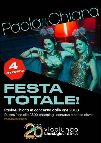 Nel The Style Outlets di Vicolungo è in programma un concerto di…Paola & Chiara! Il centro di Neinv, player leader europeo nel segmento outlet, quest’anno compie venti anni dalla sua inaugurazione e, per l’occasione, regalerà una serata imperdibile alla loro ampia clientela.