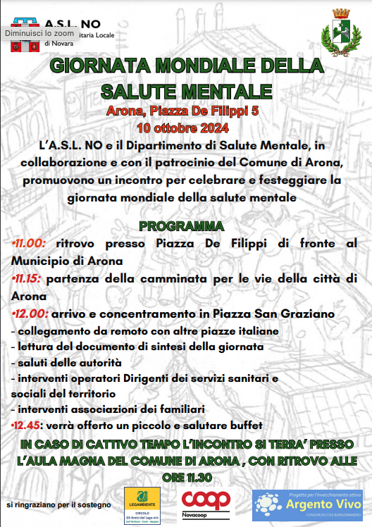 Il Dipartimento Interaziendale di Salute Mentale dell'Asl Novara, in collaborazione con la SCDU Psichiatria dell’AOU Maggiore della Carità, ha organizzato diverse iniziative in linea con il progetto nazionale “Agorai”, che coinvolgerà in contemporanea i Dipartimenti di Salute Mentale italiani in un collegamento online il 10 ottobre alle 12:00. Inoltre, nell’ambito della campagna "M'illumino di Verde", un monumento rappresentativo nelle città di Novara, Borgomanero e Arona sarà illuminato di verde, il colore simbolo della salute mentale.