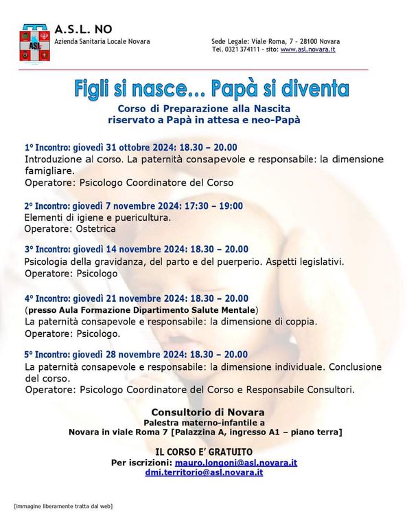 Organizzato dall'ASL di Novara, il corso offre un'importante occasione di supporto e formazione per i futuri e neo-padri, contribuendo a renderli più consapevoli e preparati nell'affrontare la nuova dimensione della genitorialità.