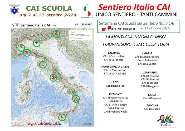 Parte da Santa Teresa Gallura, in Sardegna, e termina a Muggia, in provincia di Trieste, unendo tutte le regioni italiane attraverso la percorrenza a passo lento dei territori montani alpini e appenninici, con la loro varietà ambientale e culturale. L’iniziativa lanciata dal CAI nazionale ha raccolto l’adesione di 20 scuole di ogni ordine e grado, spalmate su 8 regioni italiane. Le escursioni sono parte di un progetto formativo più ampio che mira a sensibilizzare gli studenti sull’importanza della natura, della storia e delle tradizioni locali.