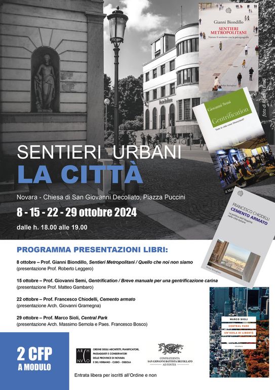 Una “lezione” speciale con Gianni Biondillo. Al via martedì 8 ottobre il primo ciclo di “Sentieri urbani”, l’iniziativa proposta dall’Ordine degli Architetti PPC delle Province di Novara e del Vco, attraverso la Commissione Formazione. Nel segmento “La città” l’incontro nella chiesa di San Giovanni Decollato a Novara. Sul tavolo due libri di Biondillo, milanese, docente all’Accademia di Architettura di Mendrisio, architetto, narratore e psicogeografo: “Sentieri metropolitani” (Bollati Boringhieri)” e “Quello che non siamo” (Guanda).
