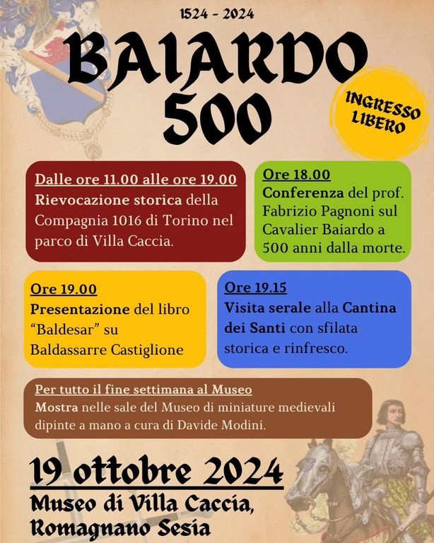 Sabato 19 ottobre, dalle 11 alle 19, il parco di Villa Caccia si trasformerà in un autentico campo medievale, offrendo ai visitatori la possibilità di immergersi nell'atmosfera del tempo. Fabbri, falegnami, erboristi, giullari, bardi e soldati daranno vita a un'esperienza interattiva unica, mostrando antiche arti e mestieri. L’evento si svolge in occasione del 500° anniversario della morte del Cavalier Baiardo, personaggio storico leggendario.