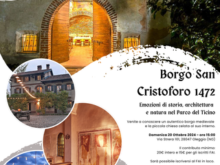 Domenica 20 ottobre 2024, il Borgo San Cristoforo 1472 aprirà le sue porte per una visita guidata organizzata dalla Delegazione FAI di Novara, offrendo ai partecipanti l’opportunità di scoprire un autentico borgo medievale nascosto nel verde del Parco del Ticino. Situato a Oleggio, il borgo custodisce una piccola chiesa affrescata, solitamente chiusa al pubblico, che sarà visitabile durante l’evento.