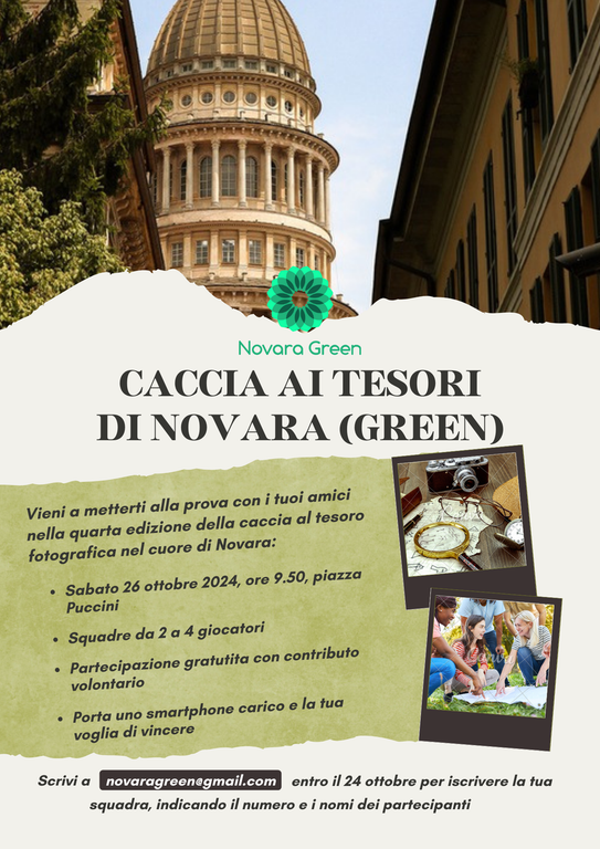 “L’idea della caccia al tesoro, che Novara Green promuove ormai da quattro anni, ci è sempre piaciuta molto e, subito dopo la costituzione del nostro gruppo, abbiamo chiesto di poterci lavorare – ha raccontato Elisa Codini – Pensiamo sia un ottimo modo per coinvolgere il pubblico giovane e, usando creatività e divertimento, portare una nuova prospettiva sulla città, spesso un po’ snobbata dalla mia generazione. È anche un momento di incontro con il mondo di Novara Green, con l’impegno dell’associazione e di noi volontari verso la cura e la valorizzazione di quanto ci sta intorno. Il piccolo spostamento semantico che abbiamo introdotto, da caccia al tesoro a caccia ai tesori, è esattamente il segno di ciò che desideriamo regalare a chi parteciperà: non una semplice caccia al tesoro a Novara, ma su Novara. Un’iniziativa leggera e divertente, legata alla nostra città, al suo centro storico e alle tante storie che lo riguardano”.