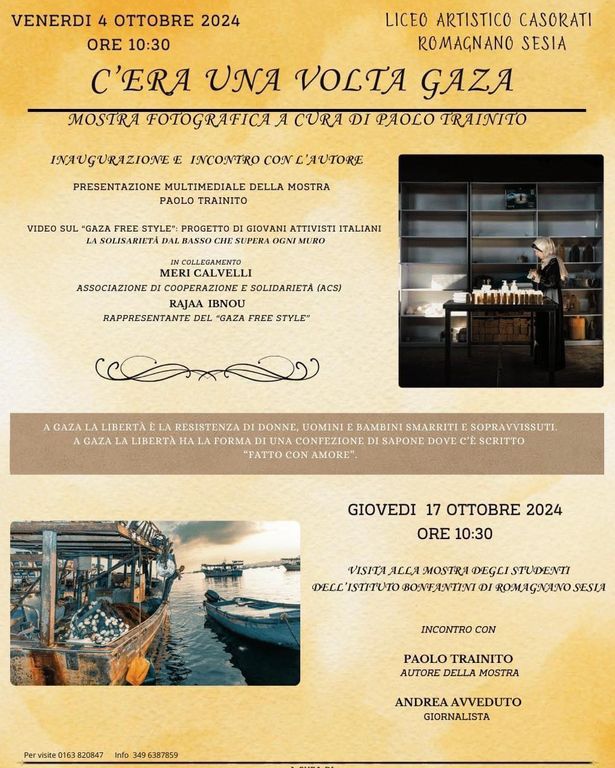 Dal 4 al 26 ottobre 2024, il Liceo Artistico Casorati di Romagnano Sesia ospita una mostra fotografica toccante dal titolo “C’era una volta Gaza”, curata dal fotografo Paolo Trainito. L’esposizione, visitabile dal lunedì al sabato, è un viaggio visivo attraverso storie di sofferenza, resistenza e resilienza di donne, uomini e bambini della Striscia di Gaza, spesso dimenticati o mai conosciuti dal resto del mondo. Per visitare la mostra è possibile prenotare chiamando il numero 349 6387859.