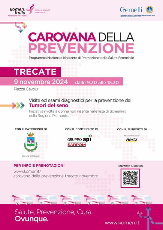 Torna, per il terzo anno consecutivo, a disposizione delle donne trecatesi la “Carovana della Prevenzione”, programma nazionale itinerante di promozione della salute di “Komen Italia”, organizzazione basata sul volontariato in prima linea nella lotta ai tumori del seno che offre attività gratuite di sensibilizzazione e prevenzione delle principali patologie oncologiche di genere.