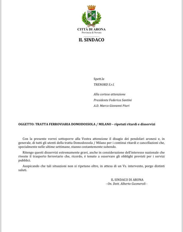 Il sindaco di Arona, Alberto Gusmeroli, ha deciso di prendere posizione a seguito delle numerose segnalazioni ricevute dai pendolari aronesi e dai cittadini che utilizzano quotidianamente la tratta ferroviaria Domodossola-Milano. In risposta alle proteste e alle lamentele, Gusmeroli ha inviato una lettera formale di protesta a Trenord, lamentando i continui ritardi e le cancellazioni che si sono intensificati nelle ultime settimane, causando gravi disagi.