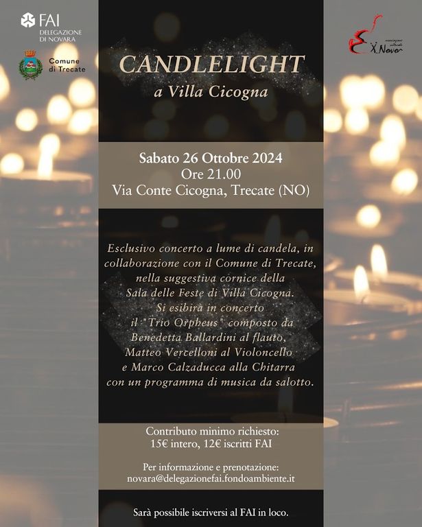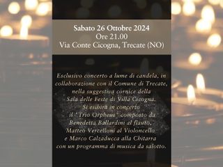 La Delegazione FAI di Novara, in collaborazione con la Città di Trecate, presenta "Candlelight a villa Cicogna", un concerto a lume di candela che si terrà il 26 ottobre alle ore 21 nella splendida sala della musica di villa Cicogna. L’evento vedrà protagonista il "Trio Orpheus", composto da Benedetta Ballardini al flauto, Matteo Vercelloni al violoncello e Marco Calzaducca alla chitarra, che proporrà un raffinato programma di musica da salotto.