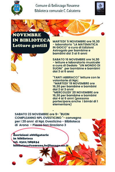 Nel mese di novembre, le iniziative del Progetto Nati per Leggere continuano a promuovere la lettura tra i bambini di età 0-6 anni. Questo mese è particolarmente significativo, poiché il Coordinamento Nati per Leggere Ovest Ticino festeggia il ventesimo anniversario dalla sua istituzione nel 2004. Oggi, il coordinamento comprende quattordici biblioteche attive sul territorio, dedicate a offrire servizi e supporto alle famiglie.