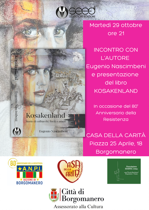 La casa della Carità di Borgomanero ospiterà, martedì 29 ottobre alle ore 21, la presentazione ufficiale del romanzo storico “Kosakenland: storie di colbacchi, fucili e amori” di Eugenio Nascimbeni, il primo prodotto editoriale della casa editrice Selvatiche Edizioni-Seed.