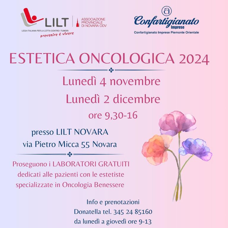 Continua l'impegno di LILT Novara e Confartigianato Imprese Piemonte Orientale con i laboratori gratuiti dedicati alle pazienti oncologiche, un’iniziativa che punta a unire bellezza e benessere. I prossimi appuntamenti si svolgeranno il 4 novembre e il 2 dicembre, dalle 9:30 alle 16, presso la sede di LILT in via Pietro Micca 55, a Novara.